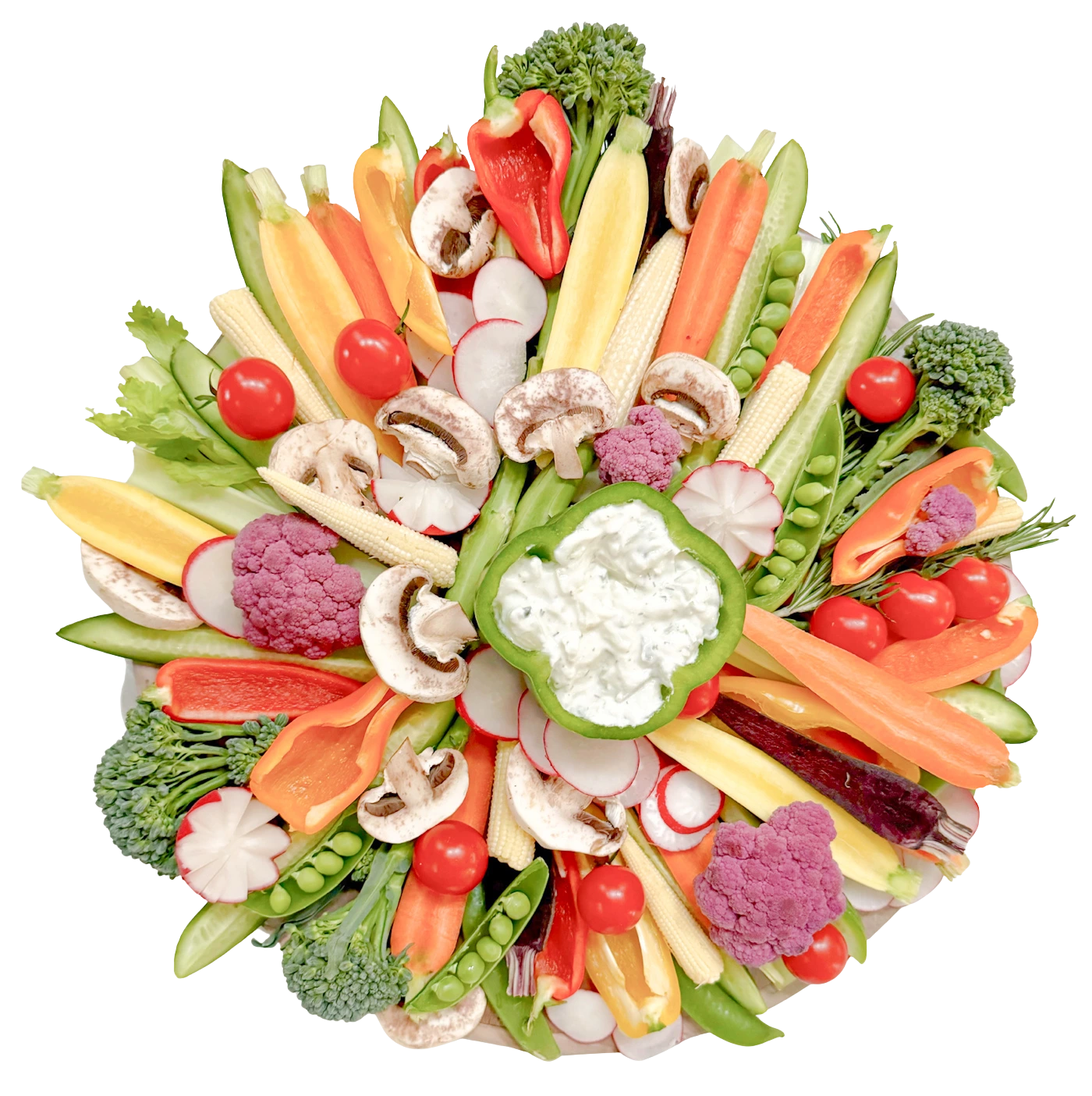 Each board includes a mix of crisp cucumber, baby carrots, celery, bell peppers, mini tomatoes, snap peas, mushrooms, broccolini, radishes, cauliflower, and baby corn. To complement the crunch and freshness, choose two dips from our trio of house-made favorites: aromatic Mediterranean hummus, cooling tzatziki, or savory roasted garlic. Vegan substitutions are available upon request, ensuring every guest can enjoy this health-conscious centerpiece.